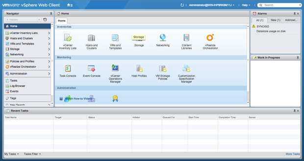 The main screen of the new vSphere Web Client looks much more like the Windows client than in previous versions. Note the Recent Tasks window at the bottom.